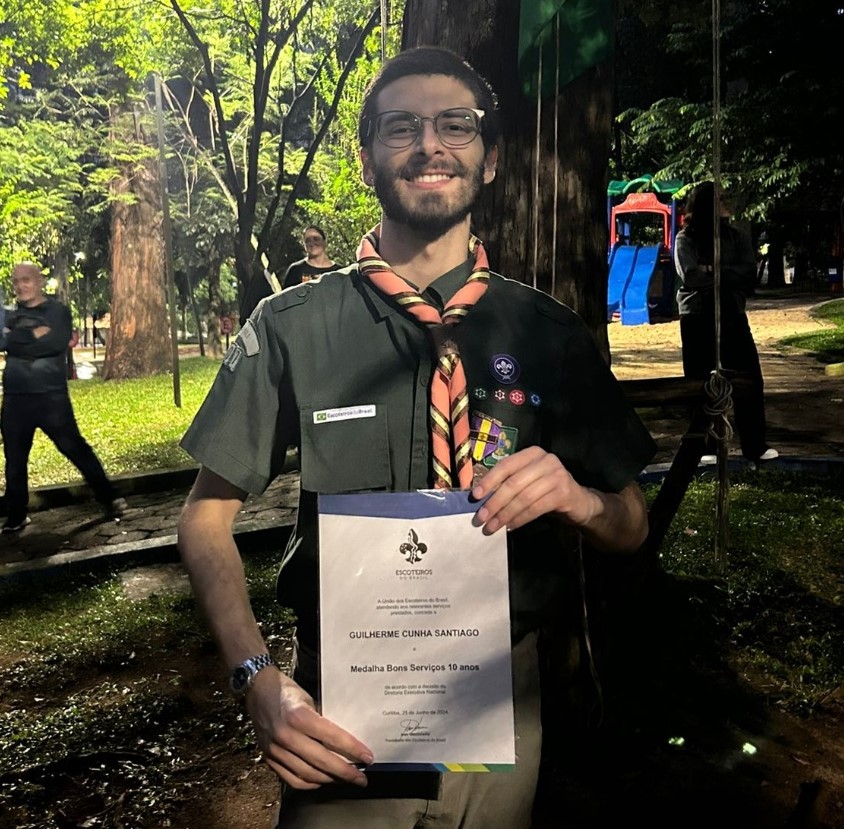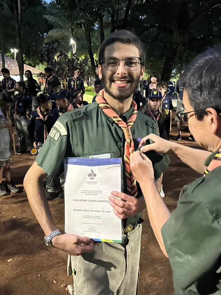 Nosso escotista do GESCS, Guilherme Cunha Santiago, recebe com muito orgulho e carinho, a Medalha de Bons Serviços – 10 anos, pelos serviços prestados!
