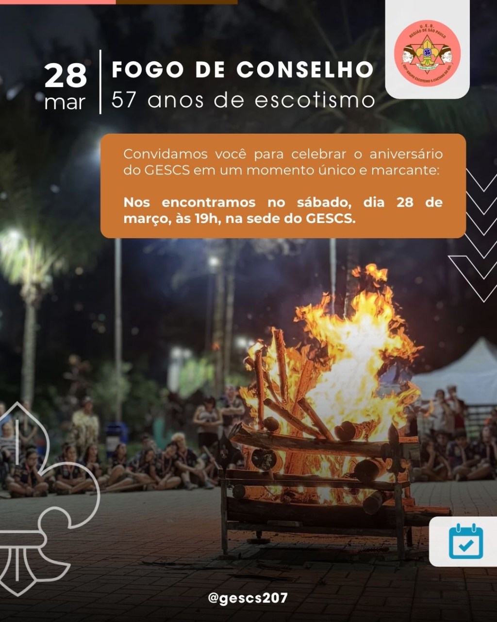 Venha celebrar conosco os 57 anos do GESCS, relembrando a sua criação em um momento único, cheio de tradição, união e espírito escoteiro ao redor do fogo!