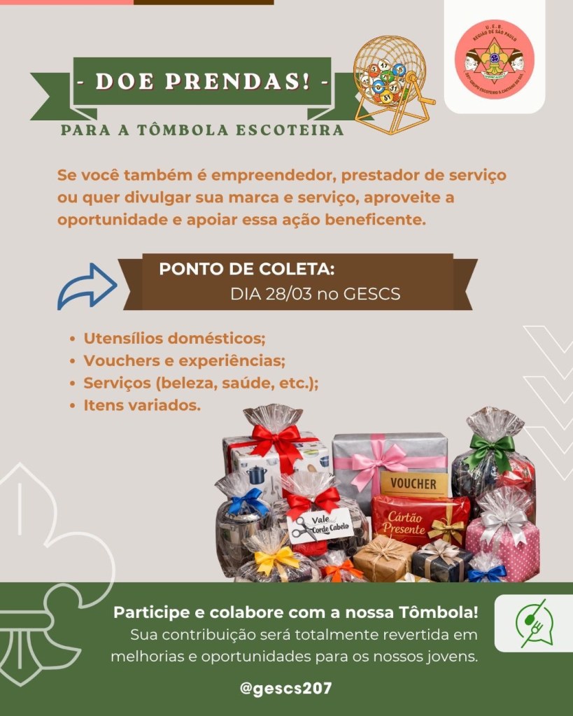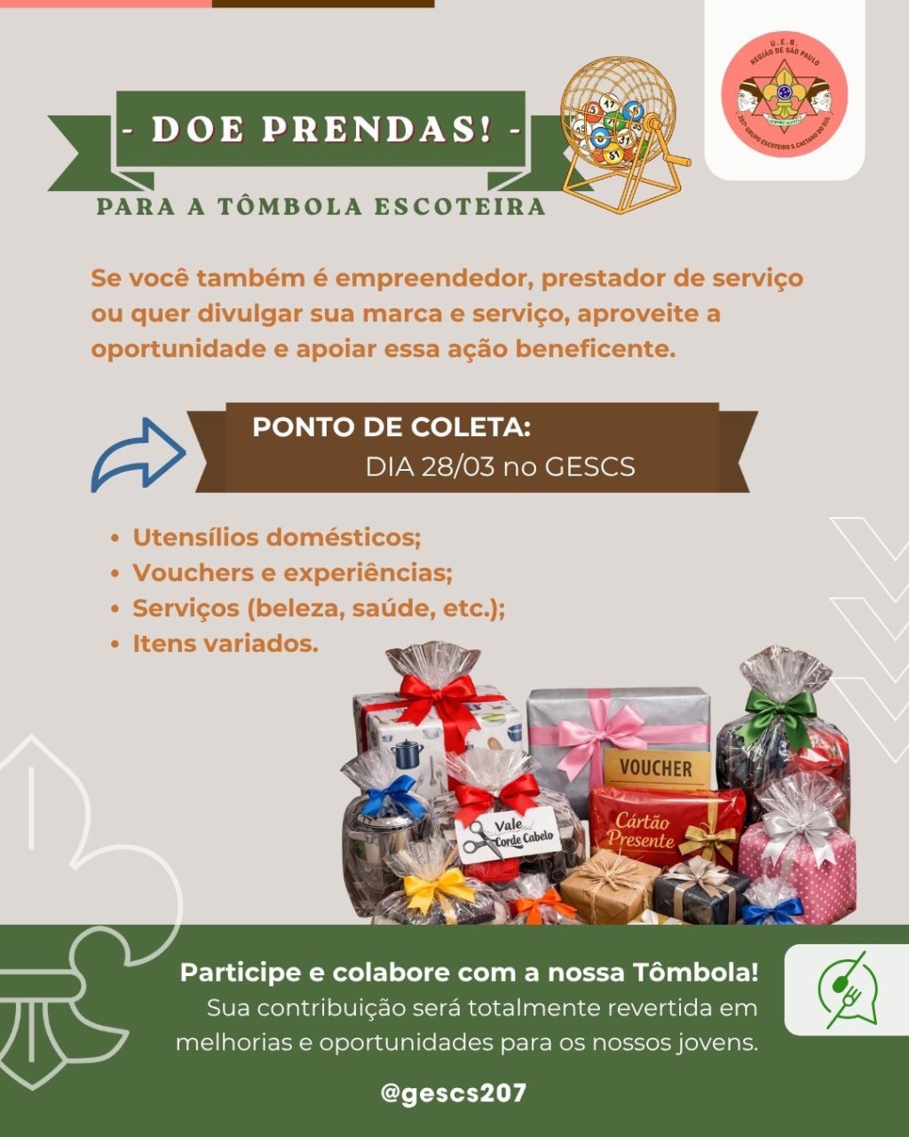 Estamos arrecadando doações para a nossa Tômbola Escoteira, que tem como objetivo gerar recursos para melhorias, atividades e oportunidades para os nossos jovens.