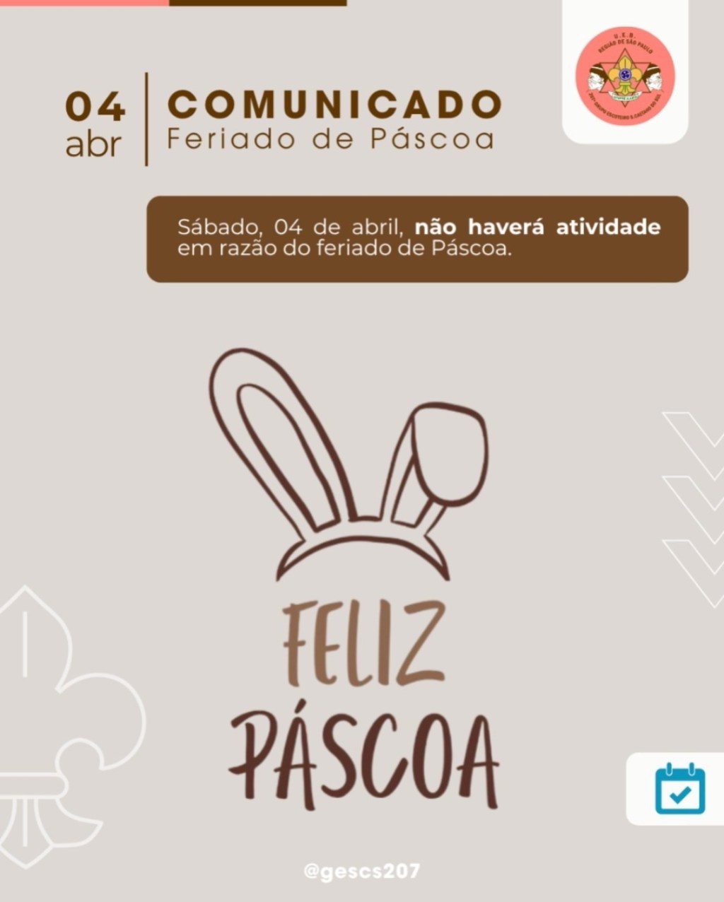 Não teremos atividade escoteiro neste sábado de feriado.