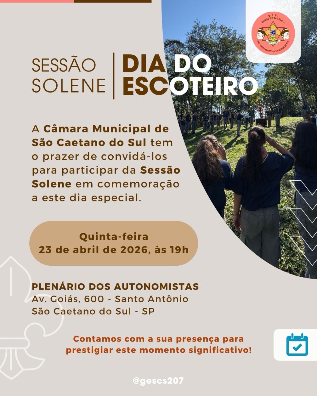 Em celebração ao Dia do Escoteiro , a Câmara Municipal de São Caetano do Sul convida o GESCS para a Sessão Solene em homenagem a todos que fazem parte dessa história.